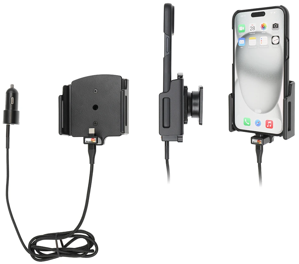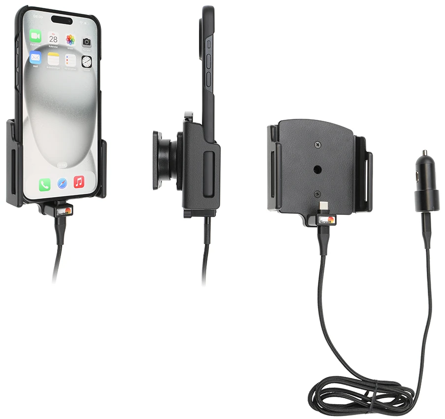 With your mobile in a holder while driving you will always have it within easy sight and reach! And with an active holder you always have a charged battery when leaving the car. Neat, discreet and convenient! With USB-cable with cig-plug adapter, choose to connect either to the vehicle's USB outlet or the 12/24V socket. The cig-plug adapter has two USB ports: Type-A and Type-C. It is easy to slide the device into place in the holder so it connects to the charging, and to take it out of the holder when leaving the car. The holder is equipped with a tilt swivel so you can easily adjust the angle for better viewing. Tilts 17° and swivels 360°. Mounting plate 42x50 mm with 4 mm AMPS-holes. Made of high grade ABS/Acetal plastic. Color: black. Made in Sweden.