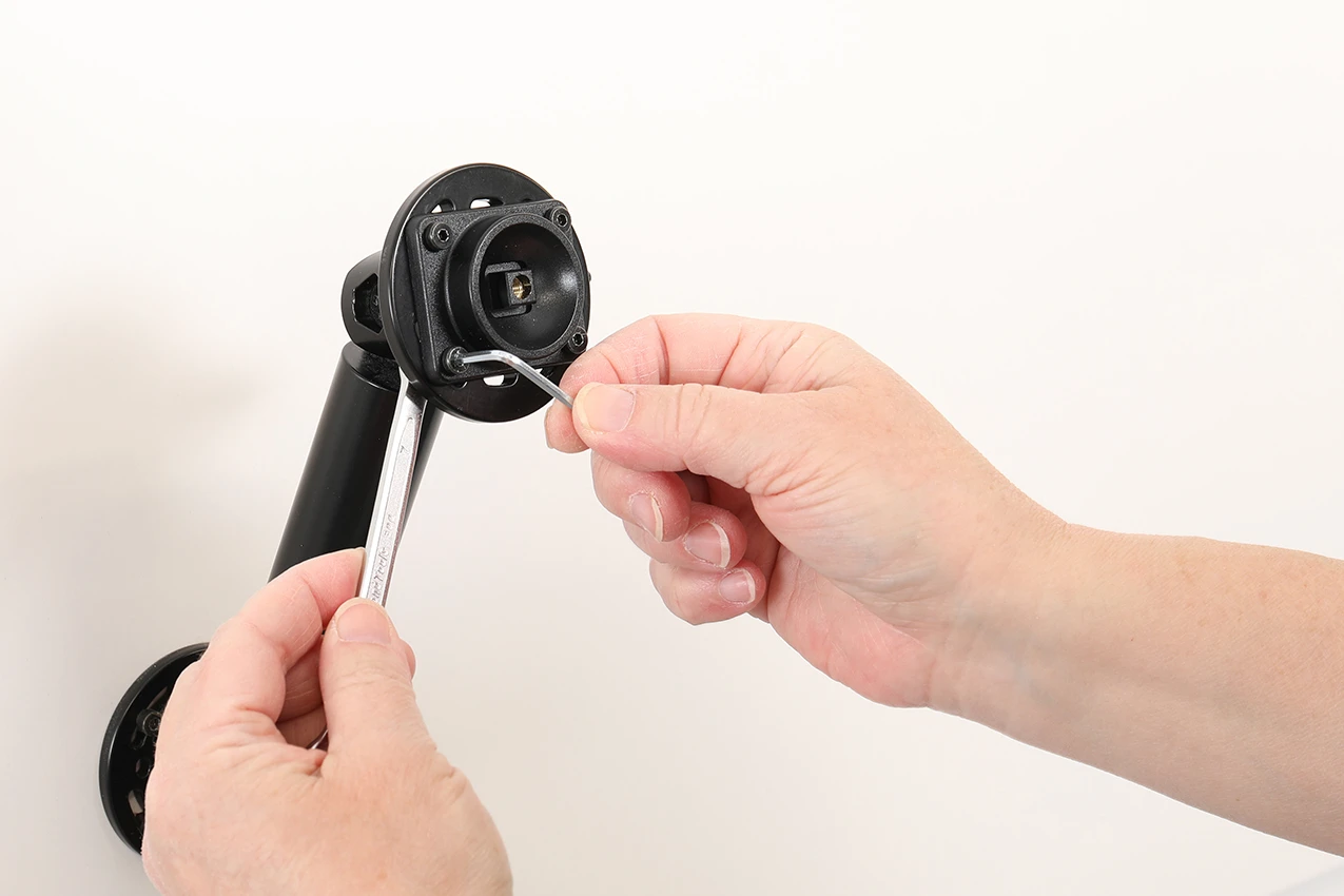 Place the holder over the attaching plate so the screw fits in the hole in the tilt swivel and screw it into place. Tighten the screw so the holder is firmly in place, but still can be adjusted.