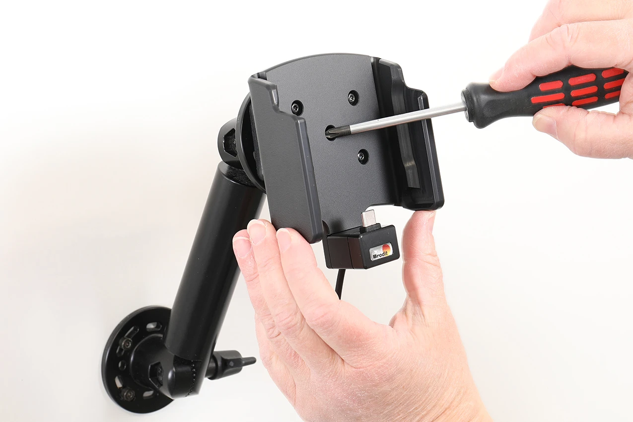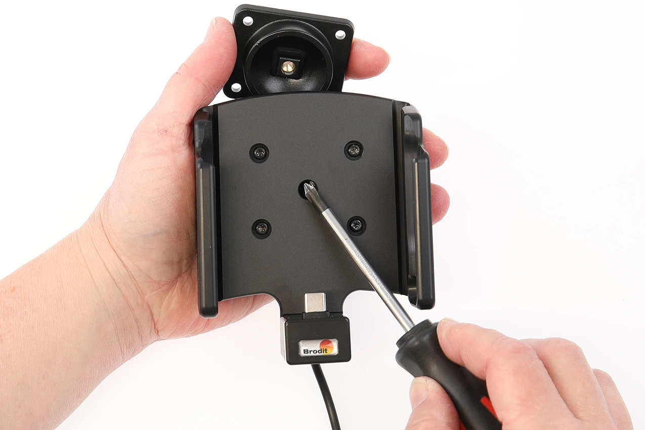 The holder is equipped with a tilt swivel so you can easily adjust the angle for better viewing, or switch between portrait and landscape mode. Tilts 17° and swivels 360°. Mounting plate 42x50 mm with 4 mm AMPS-holes. Made of high grade black ABS/Acetal plastic. Made in Sweden. Attach onto a ProClip Mounting Platform or a Pedestal Mount.