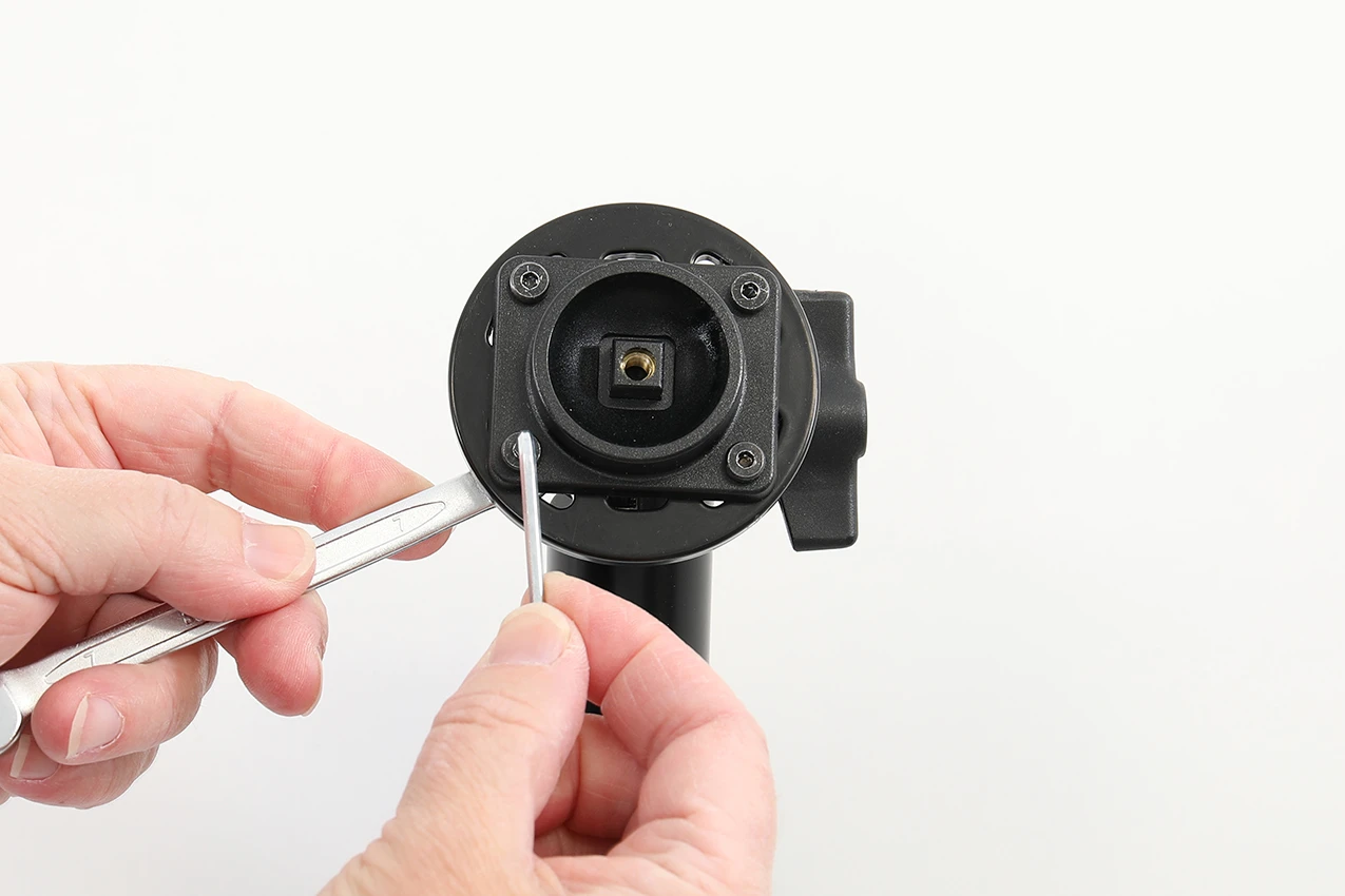 Place the holder over the attaching plate so the screw fits in the hole in the tilt swivel and screw it into place. Tighten the screw firm at first, then loosen it a bit so the holder is firmly in place, but still can be adjusted.