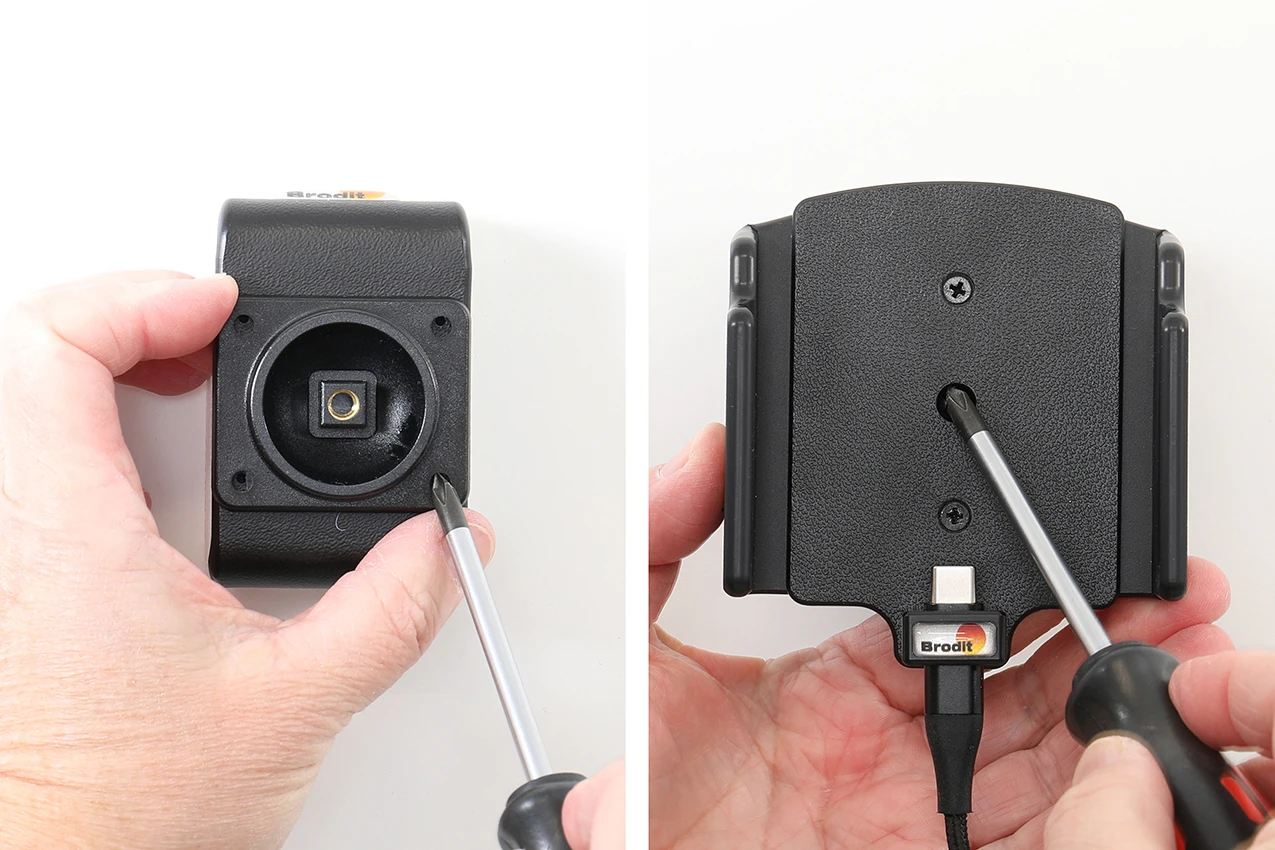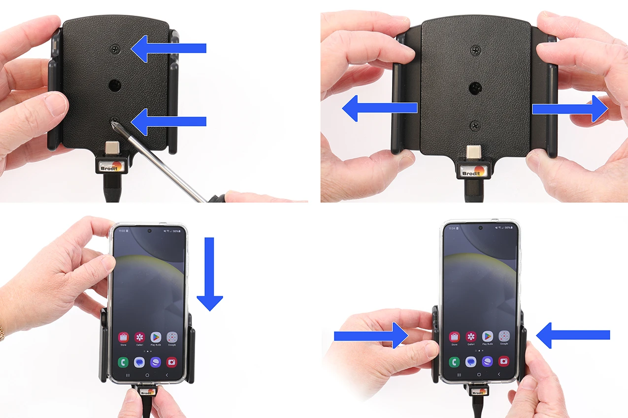 To adjust the holder for your device: Loosen the screws on the front side of the holder, so the sides of the holders can be adjusted. Place the device in the holder and press the sides together so the device is firmly in place. Remove the device carefully without moving the sides.