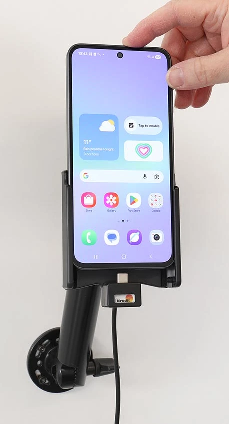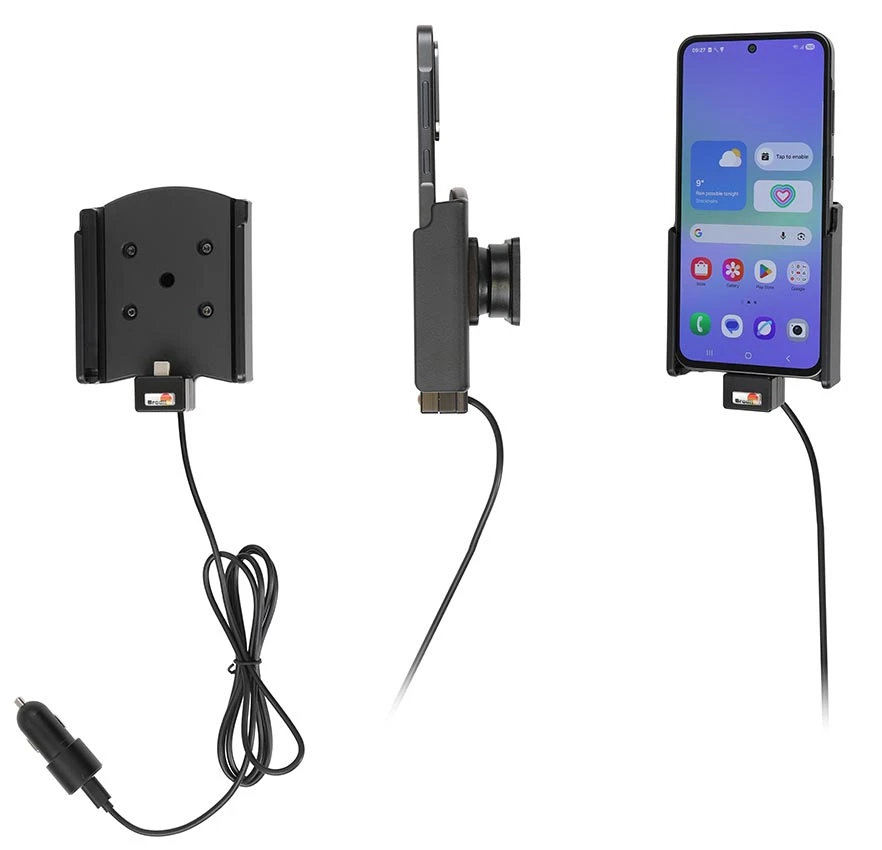 Keep your phone's battery fully charged in an active holder, always within easy sight and reach! Neat, discreet and convenient. Custom made with a perfect, firm fit. With USB-cable with cig-plug adapter, choose to connect either to the vehicle's USB outlet or the 12/24V socket. The cig-plug adapter has two USB ports: Type-A and Type-C. Type-A (free for power supply of additional device) and Type-C (connected to the holder). You have full access to the camera and all buttons when the device is in the holder. It is easy to slide the device into place in the holder so it connects to the charging, and to take it out of the holder when leaving the car.