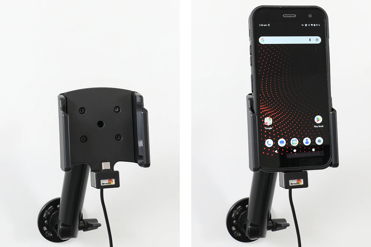 Charging via USB-C connector enables for quick charging. The cig-plug adapter has two USB ports: Type-A (free for power supply of additional device) and Type-C (connected to the holder). Choose to connect the holder either to the vehicle's USB-C outlet, or use the cig-plug adapter for the 12/24V socket. 12/24Volt.