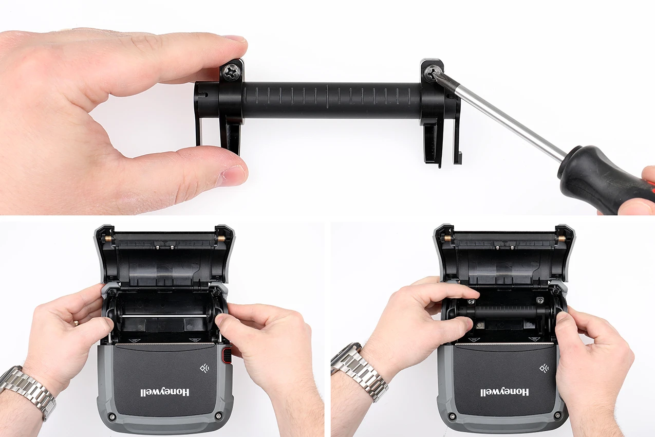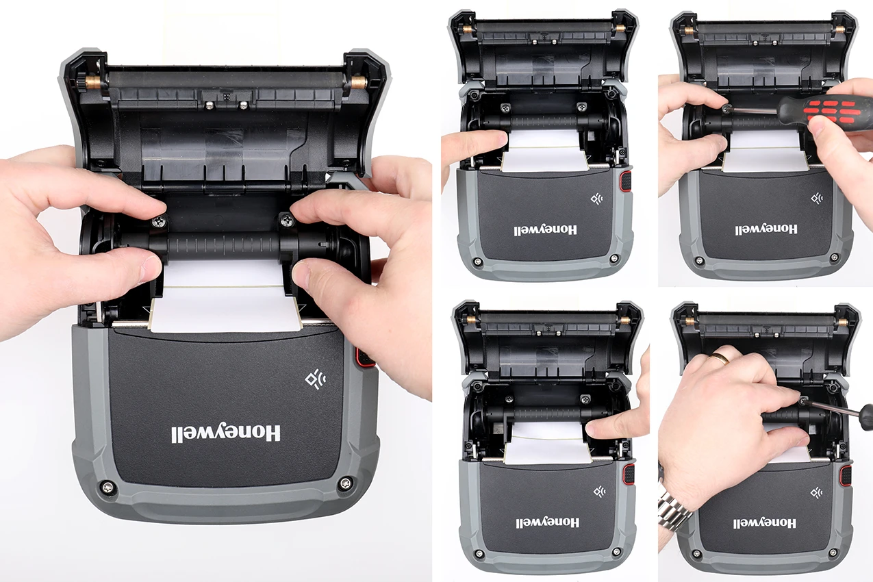 Adjustable label guide for use with external label rolls. Mounted inside the Honeywell RP4 printer to guide the labels accurately and ensure smooth feeding without jamming.