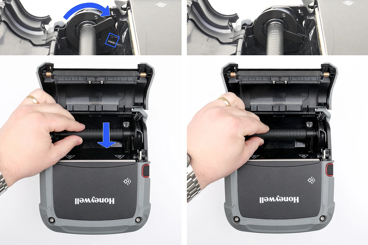 Adjust the guide arms to match the width of the label roll you are using. Press down on the arms as shown, on the opposite side from the screw, so that they move into the correct position. Then tighten the screws.