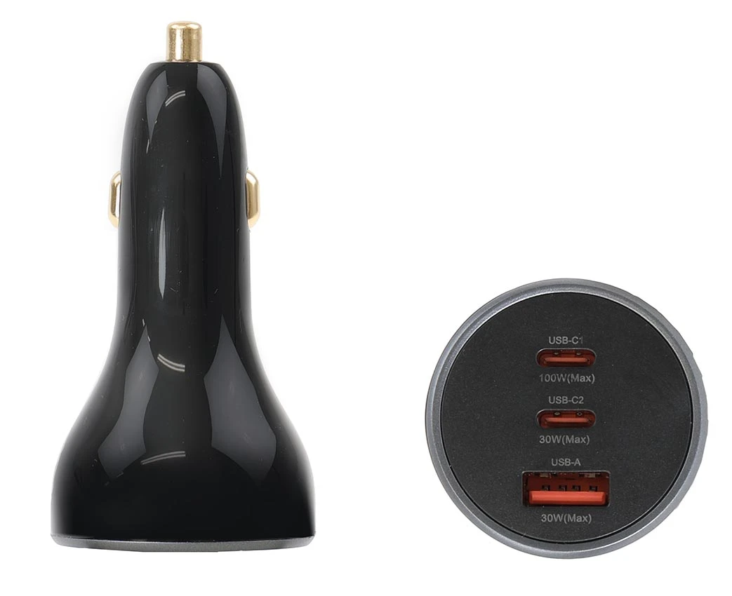 Brodit's Car Charger with two USB-C and one USB-A socket that easily plugs into the cigarette lighter socket in the car. The Car Charger has a total output of Max 160W. USB-C1 100W, USB-C2 30W and USB-A 30W. Perfect for charging multiple devices during a car trip.