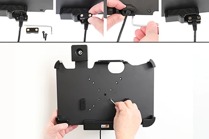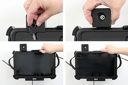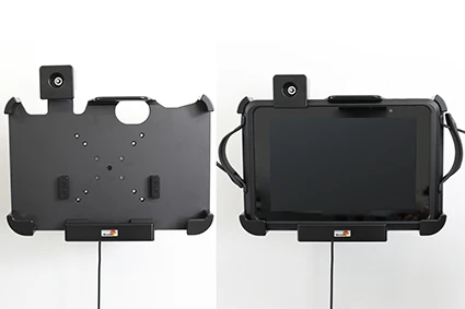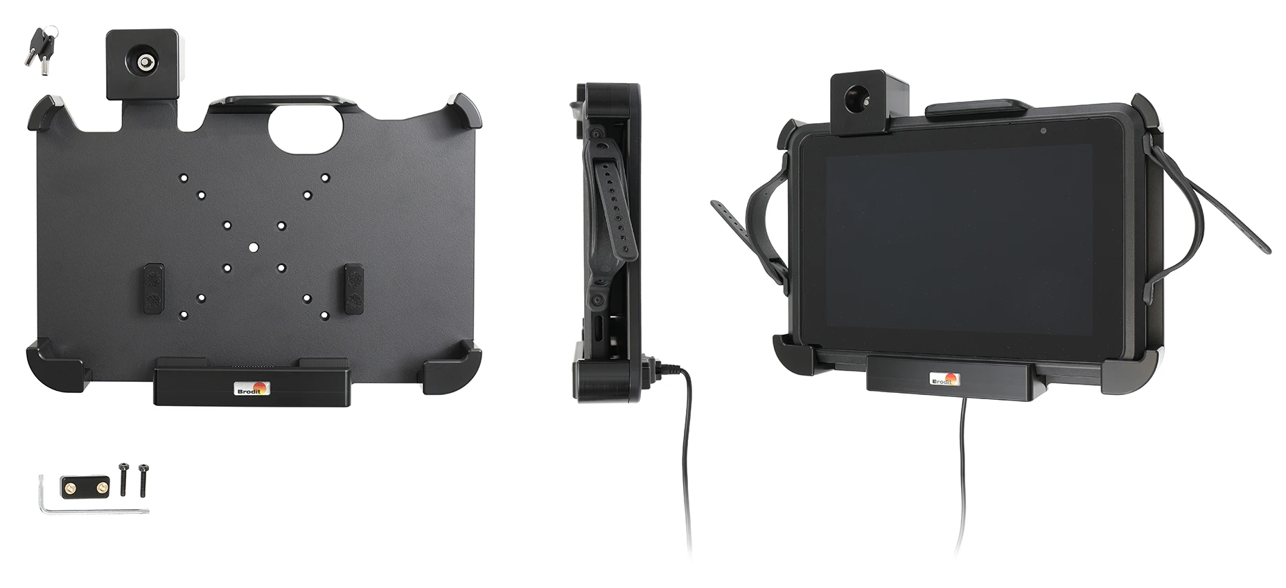 This holder is the perfect choice when you want to have your device securely locked in place and still easy accessible. Custom fit for devices with Integrated 1D/2D barcode Scanner. The holder has an extra robust design for an extra secure fit and is equipped with a lock. In order to remove the device from the holder you need a key (two keys are included). Attach the holder to any flat surface or a Pedestal Mount in a truck, distribution vehicle, warehouse etc. Predrilled AMPS and VESA 75/100 standard holes. You have full access to the camera and all buttons and outlets when the device is in the holder.