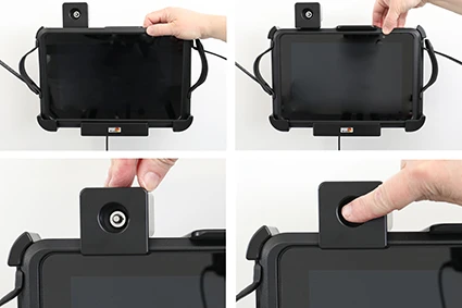 To place the device in the holder: Place the lower part of the device in the holder. Flip/press the upper part of the device forward so it snaps into place in the holder. Press the locking block downward. Press the button to lock.