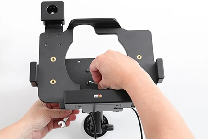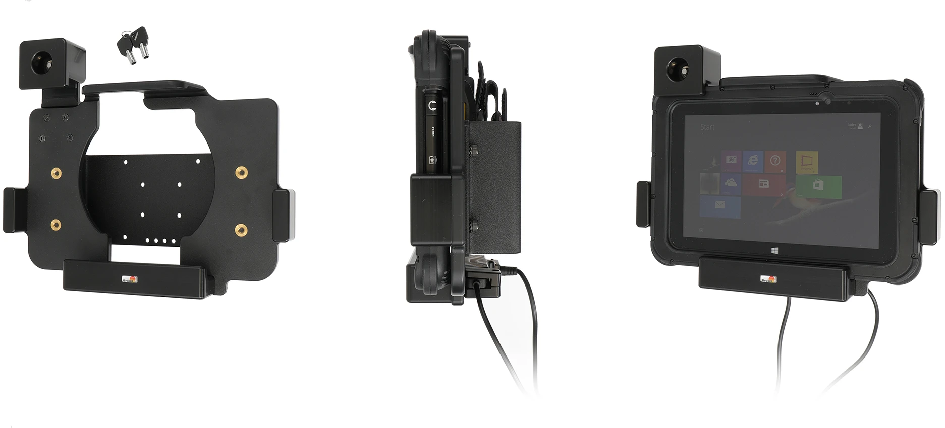 This cradle is the perfect choice when you want to have both power and USB-Host functionality, and to have it sequrely locked in place while easy accessible. Connect a cable to the DC barrel jack port for safe and reliable charging via pogo pins to the tablet and attached accessories (cable not included, sold separately). The USB-A port provides up to 1,5A so even the most demanding extended-range barcode scanner, keyboard, sensor or other accessory can be connected directly to the tablet. The key lock prevents the tablet from being removed by unauthorized personnel, in order to remove the device you will need a key (2 keys included).