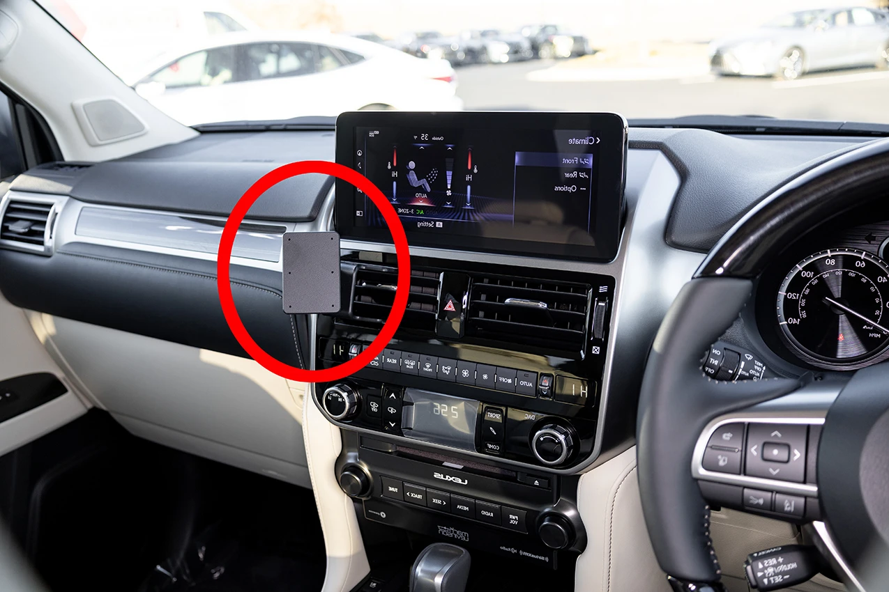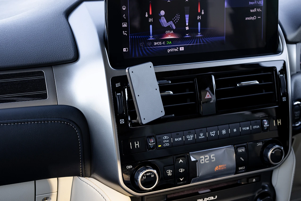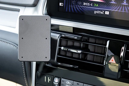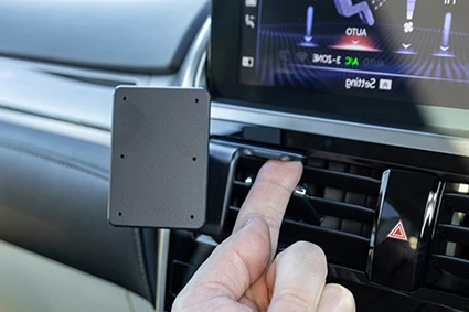 Use the enclosed alcohol pad to clean the area where the mount will be installed. Peel off the adhesive tape cover. Press the lower edge of the mount into the gap between the air vent housing and the surrouning frame.
