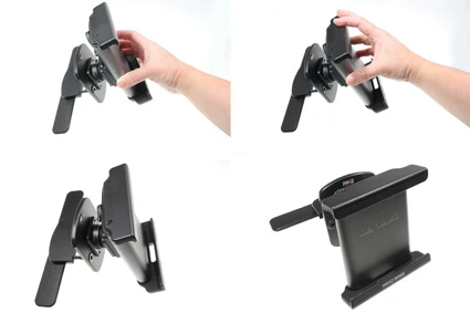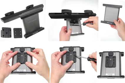 Loosen the screw in the center of the mounting adapter tilt swivel so you can remove the attaching plate on the back. Place the attaching plate onto the Brodit headrest mount. Screw the attaching plate into place with the enclosed screws. Tighten the screw so the tilt swivel is firmly in place, but still can be adjusted/angled.