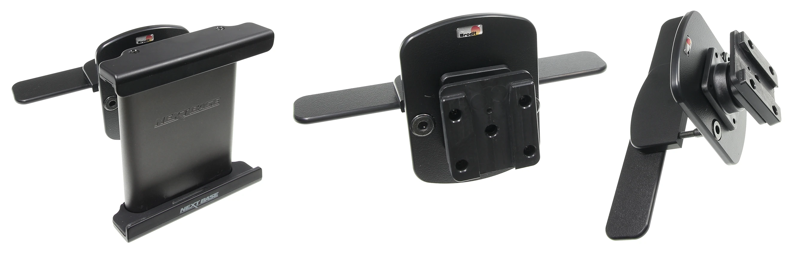 Mounting adapter with tilt swivel and a headrest mount. To be used with Nextbase original Universal Mount. The mounting adapter consists of an adapter plate that is to be attached onto the back of the Universal Mount, which then is to be attached onto a tilt swivel mount on the headrest mount.
