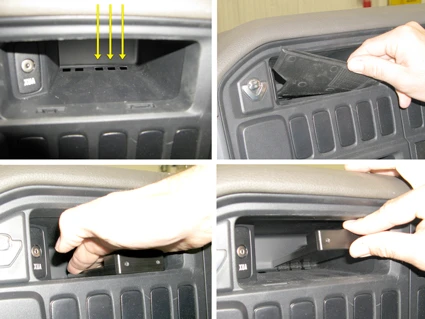 Remove the rubber mat in the compartment. Use the enclosed alcohol pad to clean the area where the ProClip is to be installed. Place the notches on Part 1 into the three holes on the left side of the compartment. Press Part 1 downward so the notches go all the way into the holes.