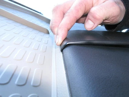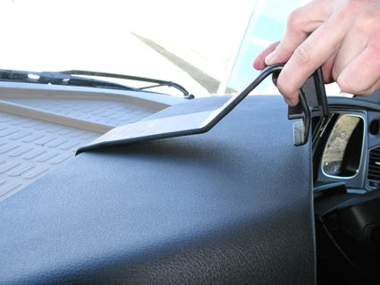 Use the enclosed alcohol pad to clean the area where the ProClip is to be installet. Remove the adhesive tape cover on the ProClip. Press the angled top part of the ProClip into the gap between the dash board and the wind shield.