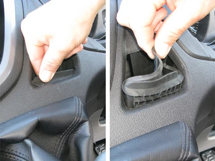 Squeeze together the edges of the rubber inlay and pull it out from the storage compartment.