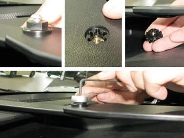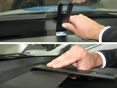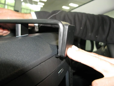 Use the enclosed alcohol pad to clean the area where the muont is to be installed. Peel off the cover of the adhesive tape of Part 1. Press the angled edge of Part 1 into the gap on top of the dashboard. Press Part 1 downward so the angled edge hooks under the front dashboard section.