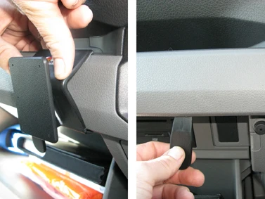 Open the glove compartment. Use the enclosed alcohol pad to clean the area where the mount is to be installed. Press the thin end of the enclosed gap opener into the gap between the glove compartment and the dashboard, to widen the gap. Peel off the adhesive tape cover on the mount. Hook the angled edge on the upper part of the mount over the dashboard edge.
