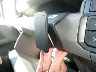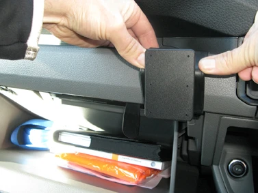 Press upward on the lower part of the mount so the angled edge goes all the way into the gap and the adhesive tape attaches. Close the glove compartment.