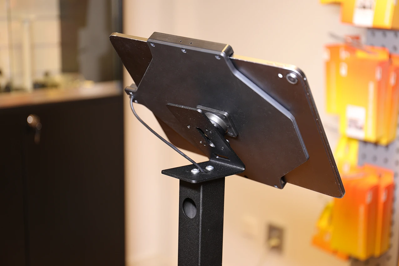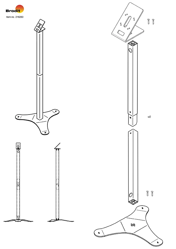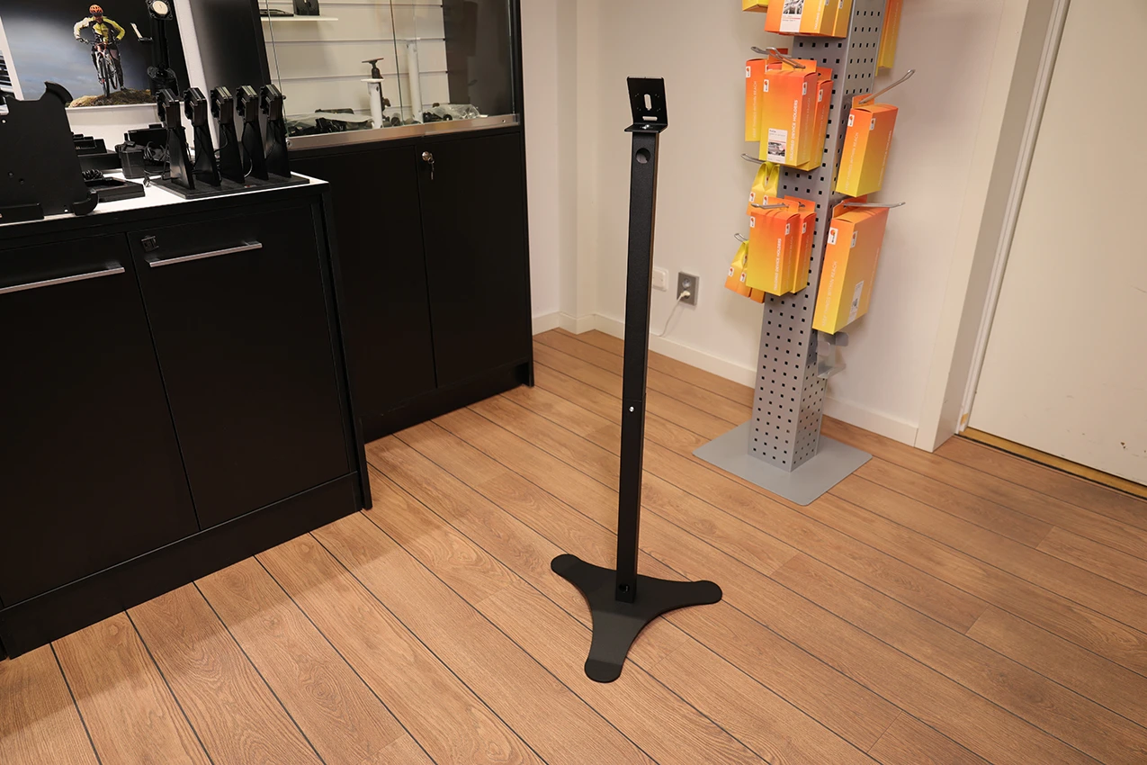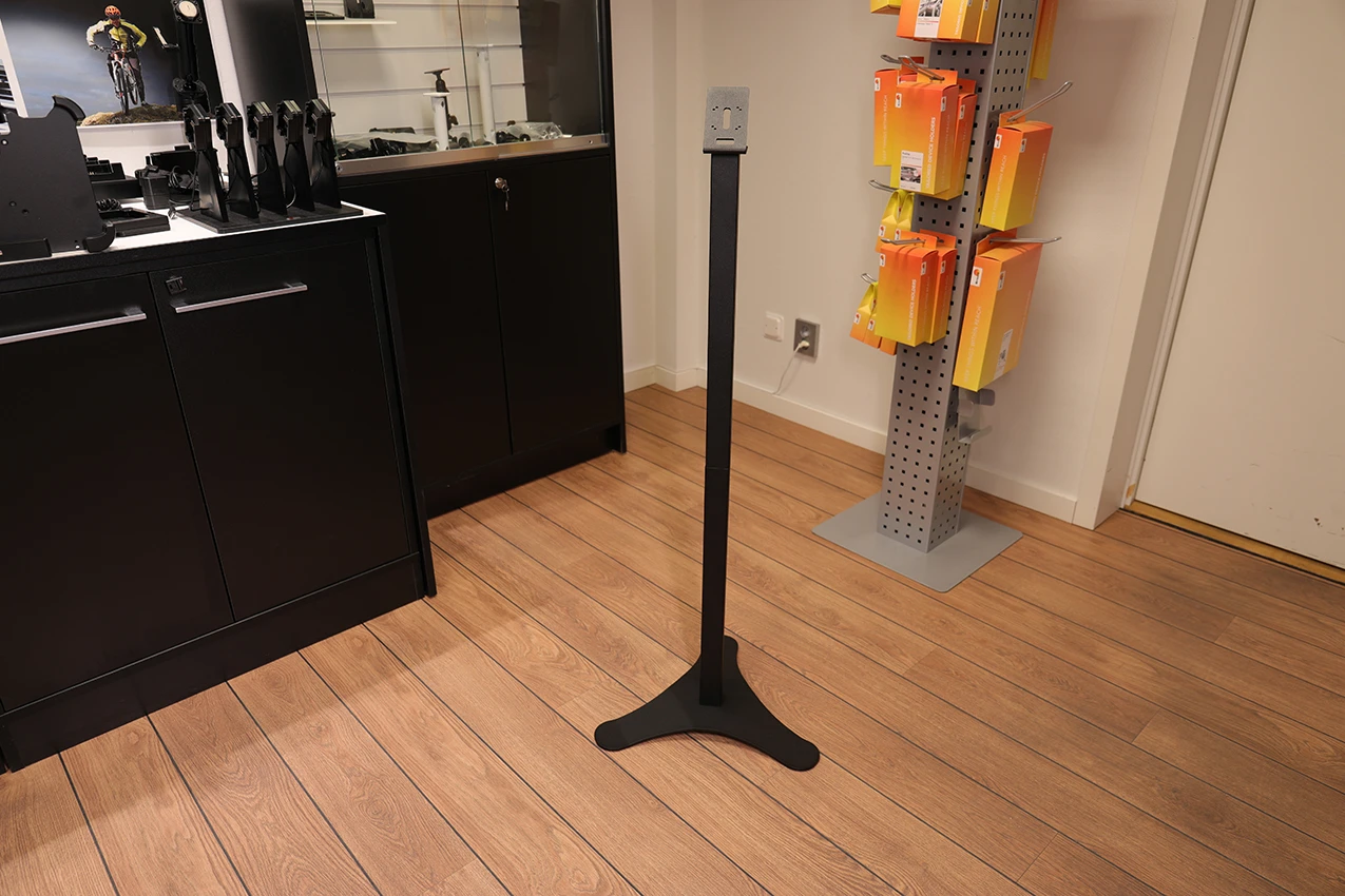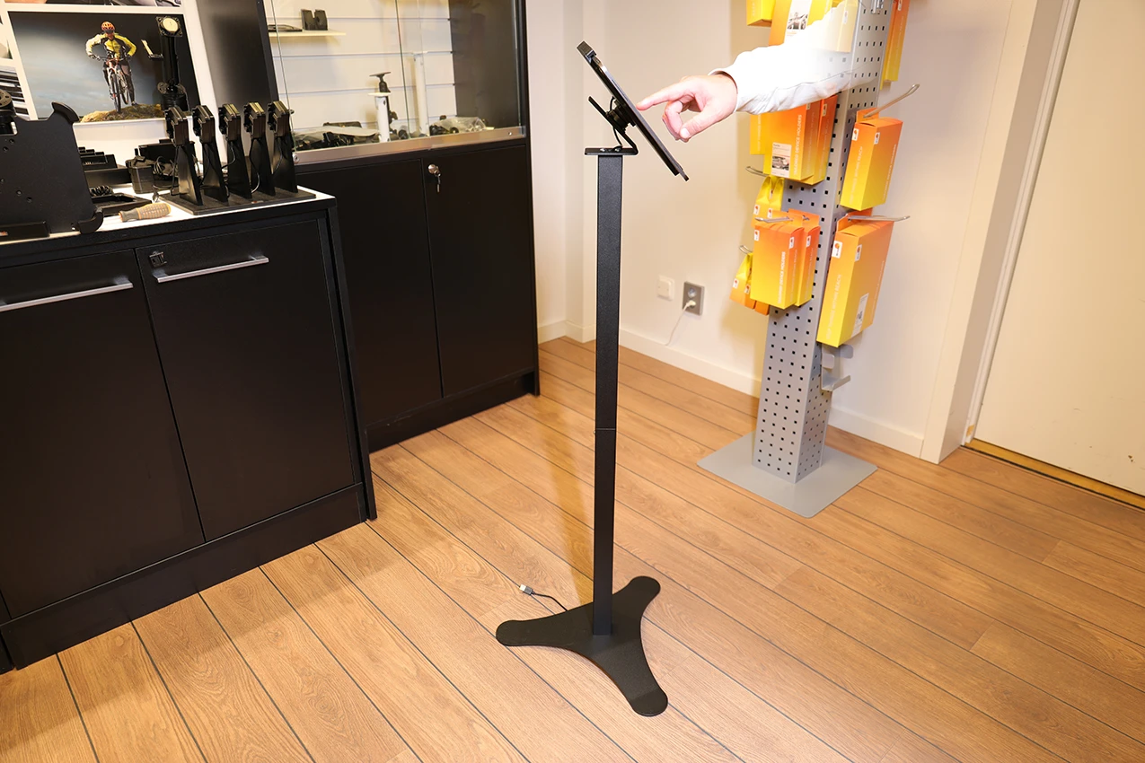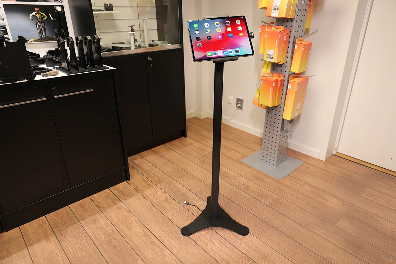 Stable, neat and discreet floor stand. Perfect for stores, exhibitions, events, entrences and all other places where you want to have a device easily accessible. The stand is hollow for cable entry. Mounting plate 60x110 mm with dual AMPS holes M4, compatible with all Brodit holders. Made in Sweden. Made of metal. Color: black. Height: 111,5 cm.