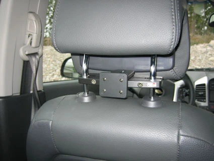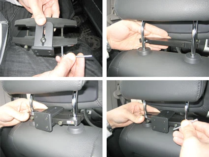 The headrest mount is to be placed onto the front seat's headrest. You can install it yourself in a couple of minutes, installation instructions are included. The face plate of the headrest mount has predrilled holes which makes the attachment of a holder easier.