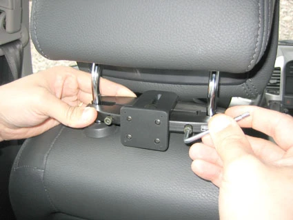Use the other enclosed tool to loosen the screw underneath the headrest mount. Adjust the mounting plate into desired position. Tighten the screw underneath the headrest mount so the mounting plate is firmly in place.