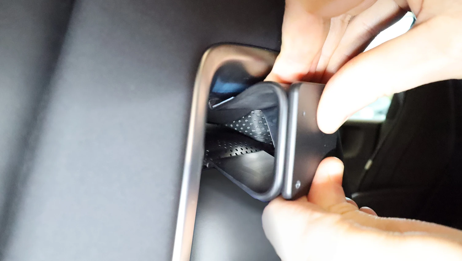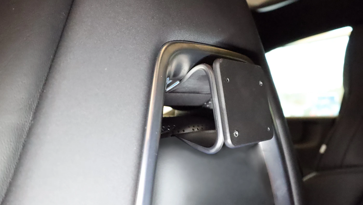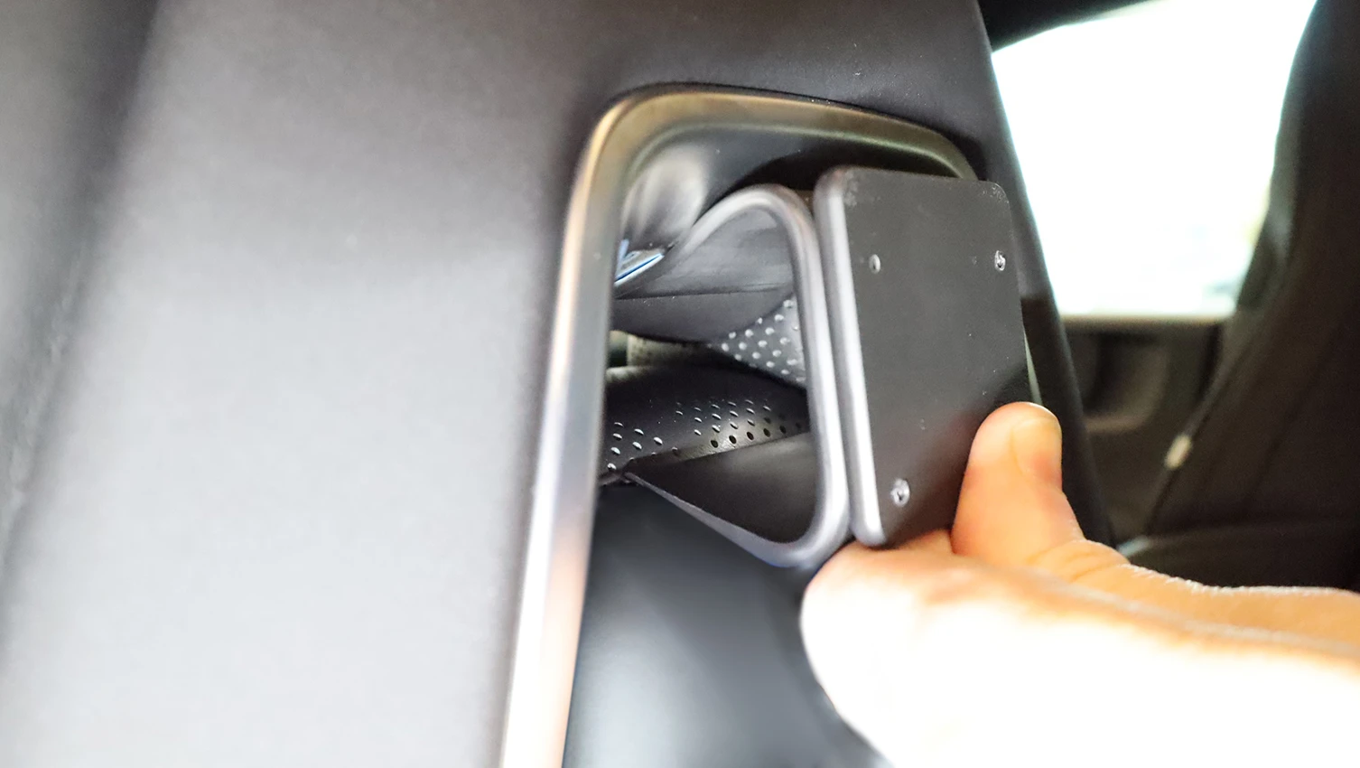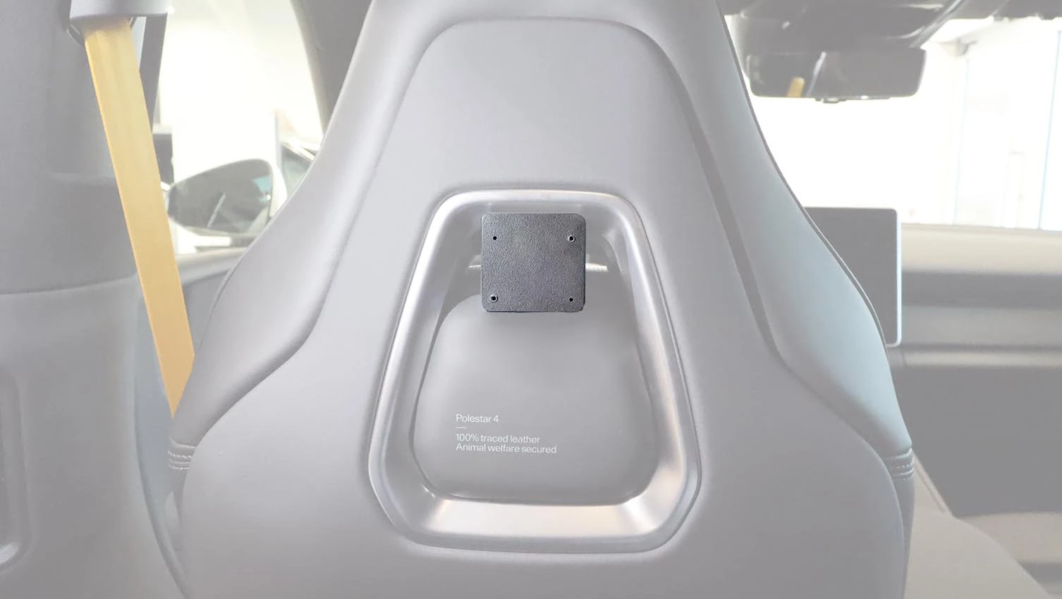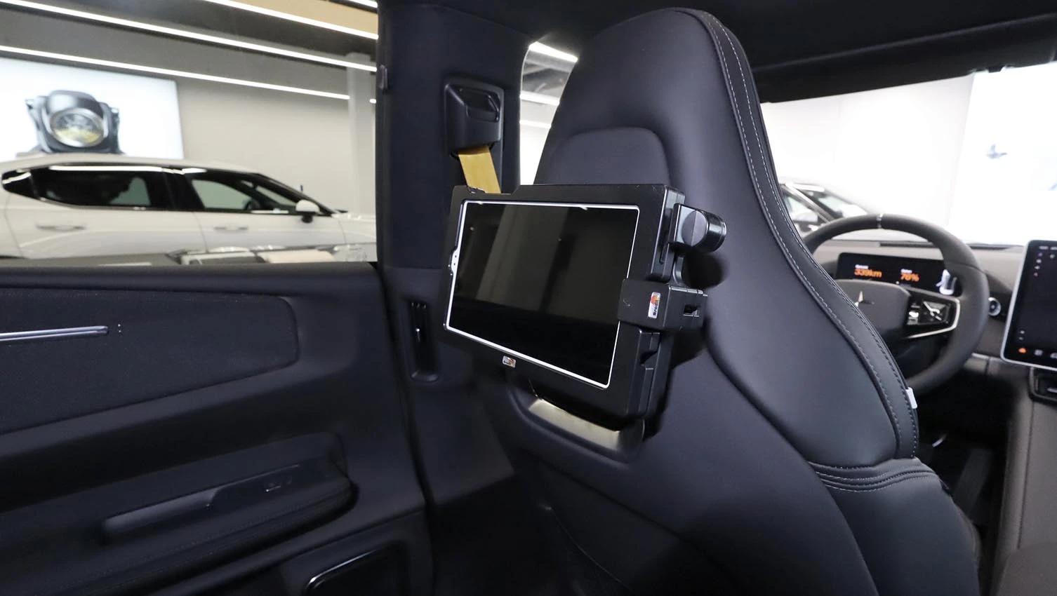 A mounting platform designed to attach to the front seat headrests, making it easy to install a tablet, screen, phone, or other device for rear-seat passengers. The device is positioned at a comfortable height and within easy reach, enhancing convenience and entertainment during the ride.