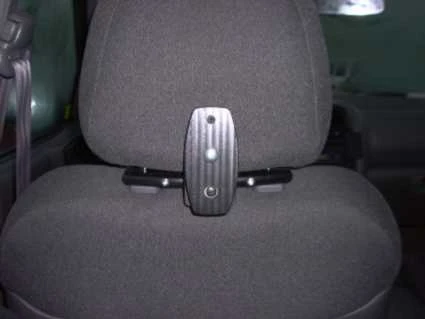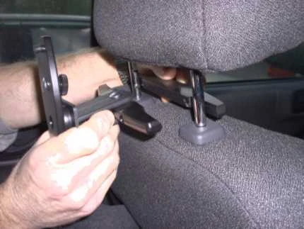Remove the head rest. Place the head rest mount onto the head rest bars. The face plate shall be on the back side of the head rest. Put back the head rest. If the head rest can not be removed, remove the two screws in the frontside of the head rest mount. Place one part of the head rest mount on each side of the head rest. The face plate is to be on the back side of the head rest. Put back the screws.