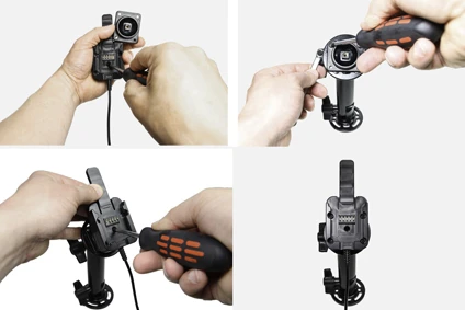 First you place your device in the heavy duty tough sleeve, which is a robust case/jacket with built in bumpers. The bumpers reduce vibration and help protect the device if dropped. Then you attach the sleeve onto an active MultiMoveClip by pressing it downward onto the mount. When it snaps into place, the charging is automatically connected via the Sliding Power Block. Thanks to the quick connector, you also remove the sleeve from the MultiMoveClip in an instant. The charging connector is durable to withstand frequent wear in everyday professional use.