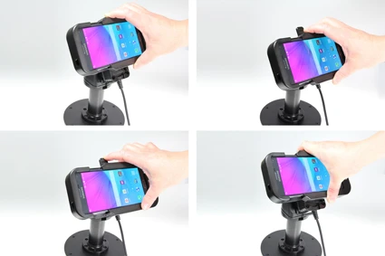 First you place your device in the heavy duty tough sleeve, which is a robust case/jacket with built in bumpers. The bumpers reduce vibration and help protect the device if dropped. Then you attach the sleeve onto an active MultiMoveClip by pressing it downward onto the mount. When it snaps into place, the charging is automatically connected via the Sliding Power Block. Thanks to the quick connector, you also remove the sleeve from the MultiMoveClip in an instant. The charging connector is durable to withstand frequent wear in everyday professional use.