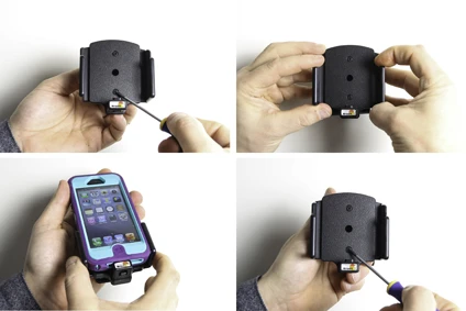 To adjust the holder for your device: Loosen the screws on the front side of the holder, so the sides of the holders can be adjusted. Place the device in the holder and press the sides together so the device is firmly in place. Tighten the screws on the front side of the holder.