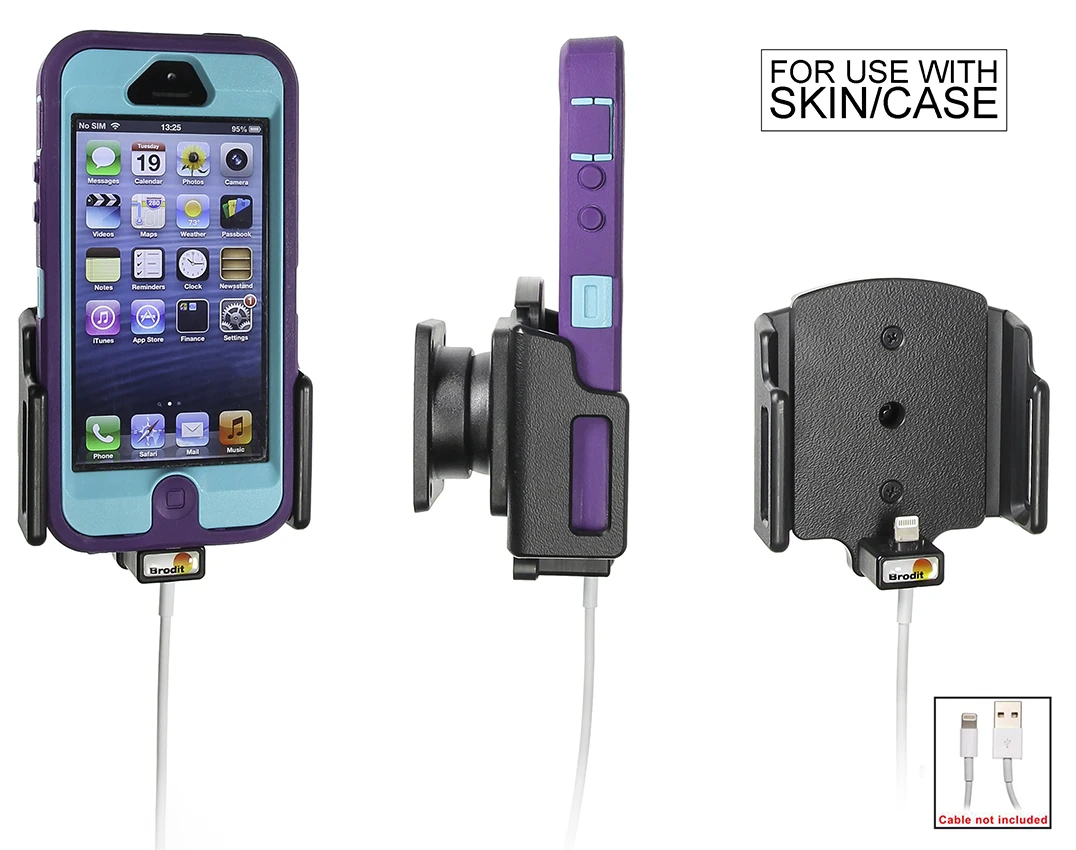 The cable attachment holder can be combined with Apple original Lightning to USB Cable (Apple article. no. MD818ZM/A. You can charge you iPhone by connecting it to the car’s USB socket, or use it with a USB/cig-plug adapter for the car’s 12V socket.