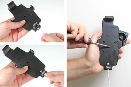 Note! Cable not included.The cable attachment holder can be combined with Apple original Lightning cable (Apple article. no. MD818ZM/A. If using the Lightning-to-USB-cable with the holder, you can charge you iPhone by connecting it to the car’s USB socket, or use it with a USB/cig-plug adapter for the car’s 12V socket.