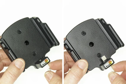 To adjust the holder for your device: Loosen the screws on the front side of the holder, so the sides of the holders can be adjusted. Place the device in the holder and press the sides together so the device is firmly in place. Tighten the screws on the front side of the holder.
