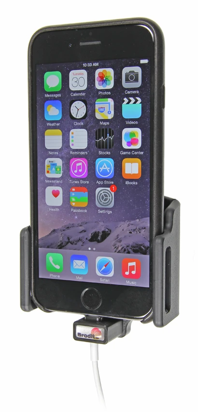 This holder for cable attachment can, combined with an Apple cable, be used for charging your iPhone. First you mount the cable into place onto the holder, then it connects automatically to your iPhone every time you place the device in the holder. You can charge you iPhone by connecting it to the car’s USB socket, or use it with a USB/cig-plug adapter for the car’s 12V socket.