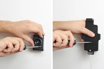 Place the connector of the cable in the hole in the lower part of the holder. Carefully press the connector downward and forward so it passes the locking and goes into the hole. Press until you hear/feel the connector snap into place in the holder. Loosen the screw in the center of the holder so you can remove the tilt swivel attaching plate on the back.