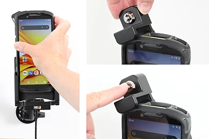 To place the device in the holder: Place the device over the holder and slide it straight downward into the holder. Slide the lock block donwward into place on top of the holder. Press the button to lock.