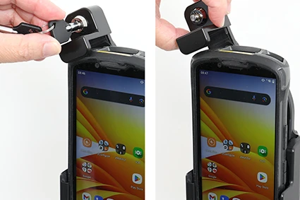 To remove the device from the holder: Use the enclosed key to open the lock. Pull the lock block straight up in order to set the device free. Lift the device straight upward, out from the holder.