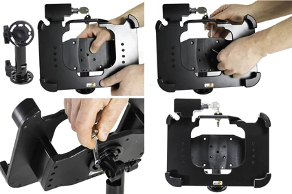 To remove the device from the holder: Use the enclosed key to open the lock. Slide the lock upward. Press upwards on the upper part of the holder, in the same time pull the upper part of the device out from the holder and then lift the device up and out from the holder.