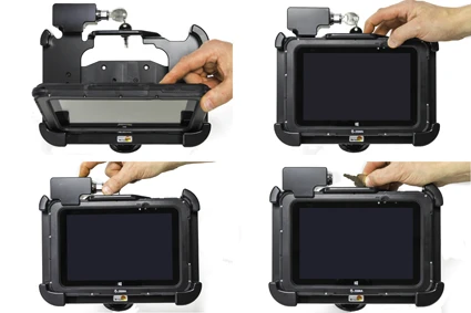 To place the device in the holder: Place the lower part of the device in the holder, then flip/press the upper part forward so it snaps into place in the holder. Push the lock downward and turn the key to lock.
