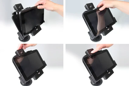 To place the device in the holder: Place the lower part of the device in the holder, then flip/press the upper part forward so it snaps into place in the holder. Push the lock downward and turn the key to lock.
