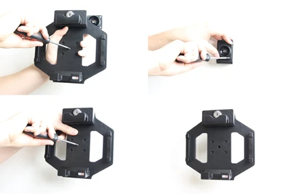 Loosen the screw in the center of the holder so you can remove the tilt swivel attaching plate on the back. Place the attaching plate onto the desired position. Screw the attaching plate into place with the enclosed screws. Place the holder over the attaching plate so the screw fits in the hole in the tilt swivel. Screw the holder onto the attaching plate. Tighten the screw so the holder is firmly in place, but still can be adjusted.