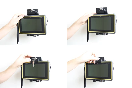 To place the device in the holder: Place the lower part of the device in the holder, then flip/press the upper part forwards so it snaps into place in the holder. Push the lock downwards and turn the key to lock the unit into the holder.