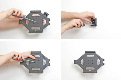 Loosen the screw in the center of the holder so you can remove the tilt swivel attaching plate on the back. Place the attaching plate onto the desired position. Screw the attaching plate into place with the enclosed screws. Place the holder over the attaching plate so the screw fits in the hole in the tilt swivel. Screw the holder onto the attaching plate. Tighten the screw so the holder is firmly in place, but still can be adjusted.