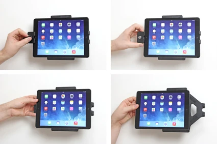 Slide the device sideways carefully into the holder. Press the lock sideways onto the left part of the holder. Press the button to lock.