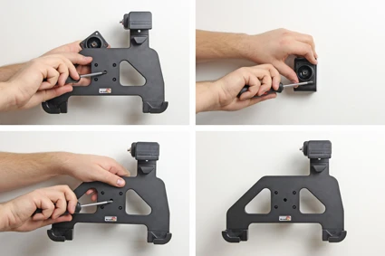 To remove the device from the holder: Use the enclosed key to open the lock. Slide the locks upwards. Pull the upper part of the device out from the holder and then lift the device up and out from the holder.