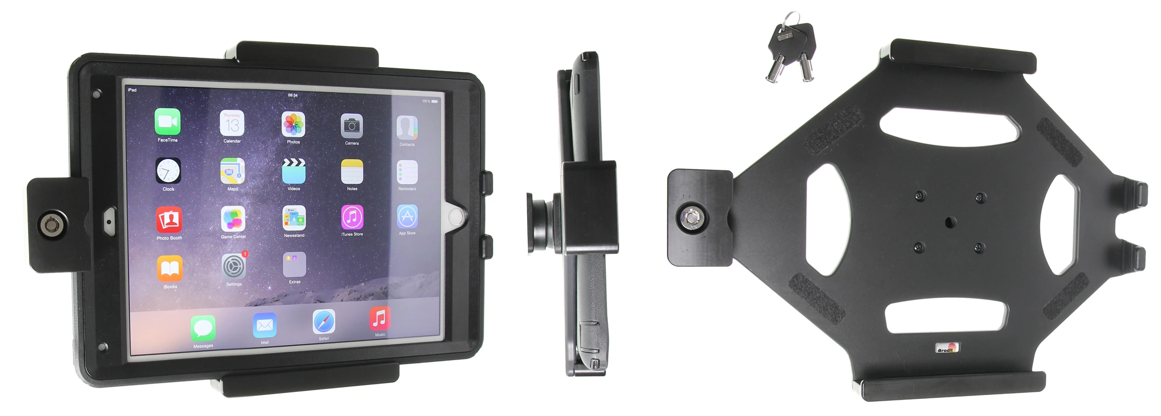 An installation of a tablet onto a vehicle’s dashboard is always done on the customer’s own responsibility. Brodit recommends to use tablets on the car’s headrest, installed onto a Brodit headrest mount.