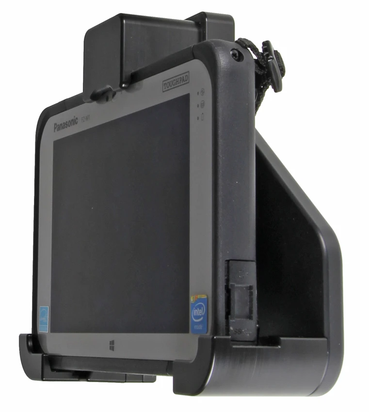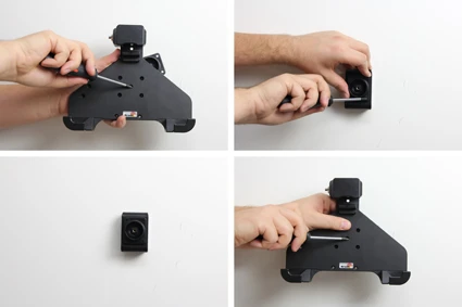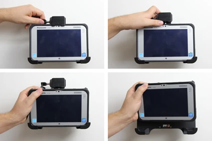 To place the device in the holder: Place the lower part of the device in the holder, then flip/press the upper part forwards so it snaps into place in the holder. Push the lock downwards and turn the key to lock the unit into the holder.