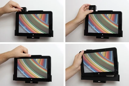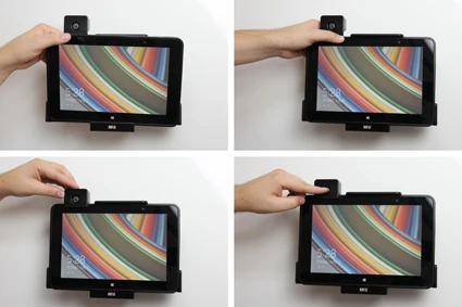 The holder is also perfect for use in stores, at exhibitions and any place where you want to use your ET50/55 without having it easy removable. The holder is made of extra strong plastic and is equipped with a lock. In order to remove the ET55 from the holder you need the key, two keys are included. The holder is mounted onto a tilt swivel. This mean that you can adjust the angle in order to avoid light reflection on the screen. You can easily switch between portrait and landscape mode by turning the holder into desired position.