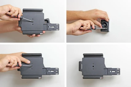 Adjust the holder to fit your device: Loosen the screws on the front side of the holder, as well as the screw on the adjustable arm. Pull the adjustable sides apart until you reach maximum width and pull out the adjustable arm. Slide your device sideways into the holder. Press the sides together so the device is firmly in place. Place the locking block onto the adjustable arm and press it toward the device.