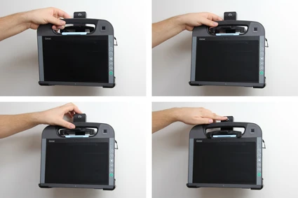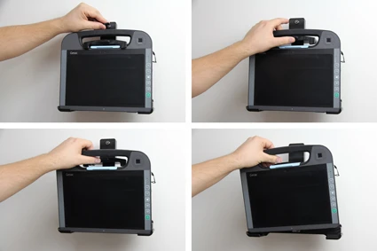 To remove the device from the holder: Use the enclosed key to open the lock. Slide the locks upwards. Pull the upper part of the device out from the holder and then lift the device up and out from the holder.